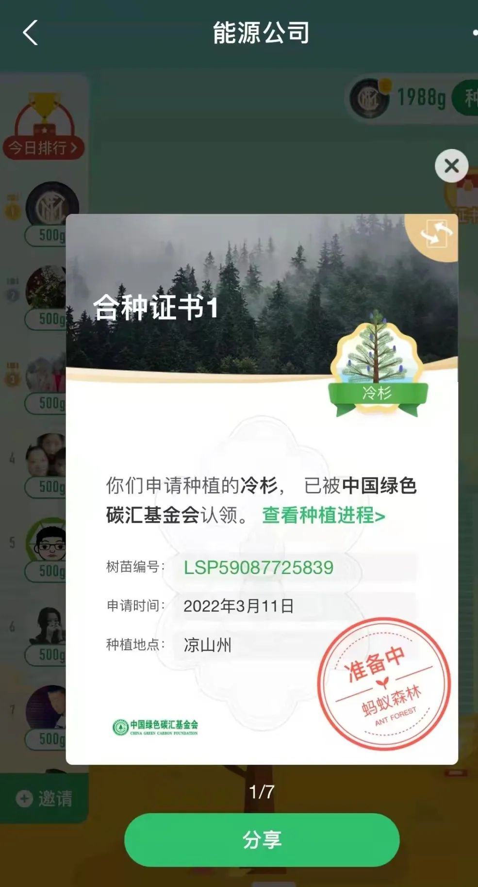 “一花一草皆生命,一枝一葉總關(guān)情?!痹缭?019年起,公司就通過支付寶螞蟻森林組建了一只“能源公司云種樹小隊”,如今隊伍人數(shù)越來越壯大,已有59位隊員,截止目前,在酒泉、大理、邯鄲等地,種下了冷杉、側(cè)柏、云杉、胡楊等7棵大樹。3月11日,在小伙伴的共同努力下,我們又種下了一棵冷杉樹,該樹被中國綠色碳匯基金會認(rèn)領(lǐng),將種植到?jīng)錾街莸貐^(qū)。